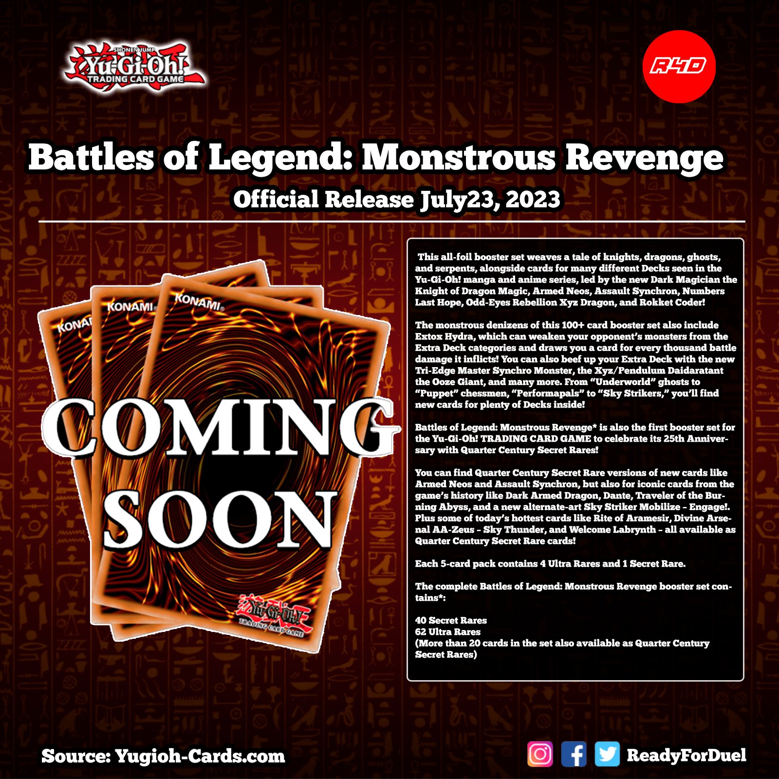 Prices are updated based upon YuGiOh Battles of Legend: Monstrous Revenge listings that sold on eBay and other marketplaces. Prices are updated based upon YuGiOh Battles of Legend: Monstrous Revenge listings that sold on eBay and other marketplaces. 1 Features; 2 Breakdown; 3 Gallery; 4 List; 5 Trivia; 6 External links; Features [] Introduces the Quarter Century Secret Rare rarity to TCG.